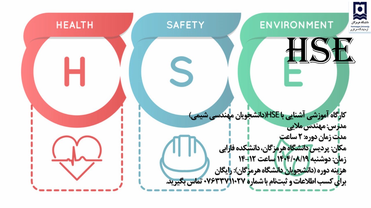 به اطلاع دانشجویان گرامی میرساند، آزمایشگاه مرکزی دانشگاه در راستای ارتقای سطح آگاهی و ایمنی در محیطهای آزمایشگاهی، دوره آموزشی "ایمنی در آزمایشگاه (HSE)" را ویژه دانشجویان جدیدالورود برگزار میکند.